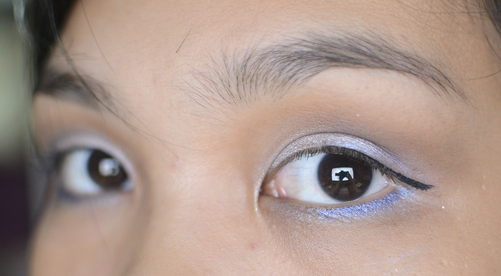 My memory of the Patronus Charm is of a burst of white and blue light that’s very clean and visually strong. Here, I’ve used a very shimmery white-silver, bareMinerals’ Silver Dollar, and faded it out into a beautiful white and purple-blue duochrome, Femme Fatale’s Ancient Traitor on the upper lid. I blended it out with a crease color, Le Métier de Beauté’s Tamarack. On my lower lash line, I have Urban Decay 24/7 Glide-On Eye Pencil in Ultraviolet, smudged out with Shiro Cosmetics’ Tardis.