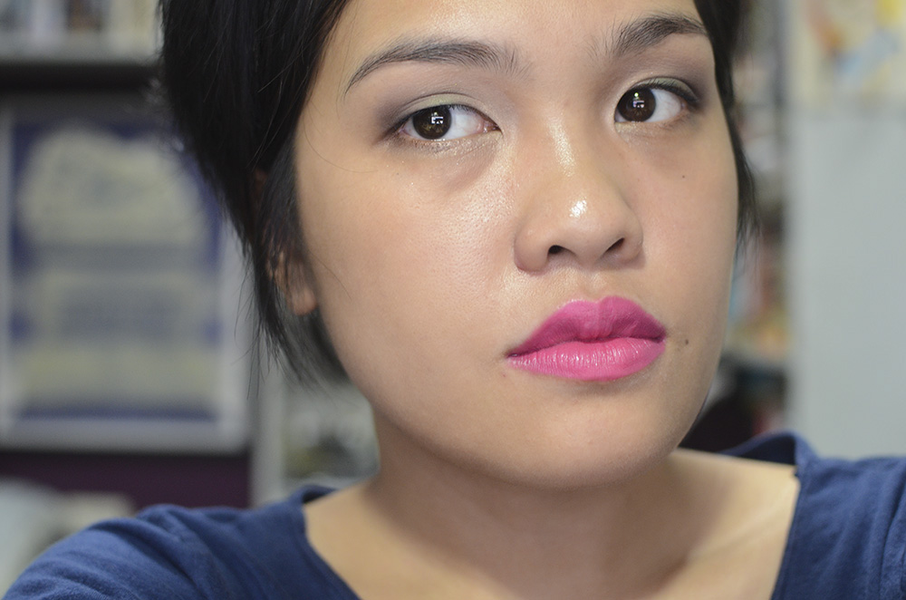 L407, like I said, is a vastly different when worn. Are you surprised? It is described as a “deep pink.” I think it’s got a bit of blue, maybe? Some lavender? I really like this shade. It’s the most understated of the three that I have, and considering it’s still quite blindingly bright, I think it says quite a bit about the Hot Lips range.