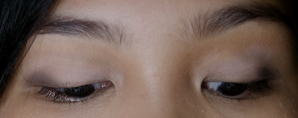 I used Strawberry Mousse all over the lid (not very “strawberry,” though—it looks like a cream shade) with Toasted Espresso as an outer ‘v’ shade and Rose Gold to line my upper and lower lash lines.