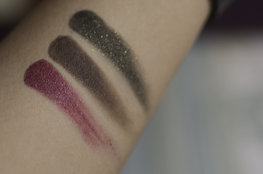 Swatched, L-R: Stylenanda 3CE Gel Eye Liner in L.O.V.E.*, Glitter Red Bean, Glitter Khaki