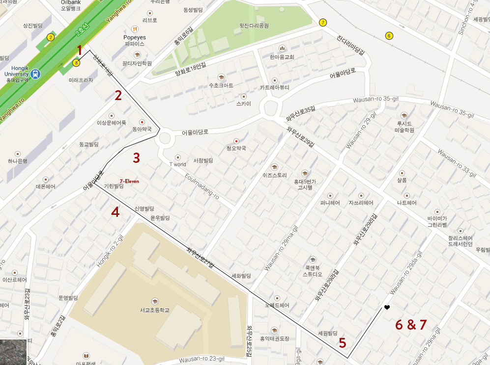5. Walk the length of the street and turn left at a cafe called La Main Douce, into the 4th junction, Wausan-ro 29da-girl Road (와우산로29다길).