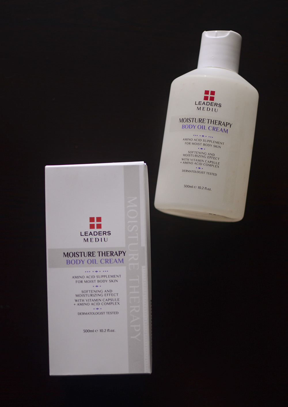 The Leaders products I’ve received have been OK for me to try (I especially loved the acne patches), so I was excited to try this one. The Moisture Therapy Body Oil Cream claims to soften moisturize the skin using its blend of amino acid complex, vitamin capsule, and herb complex.