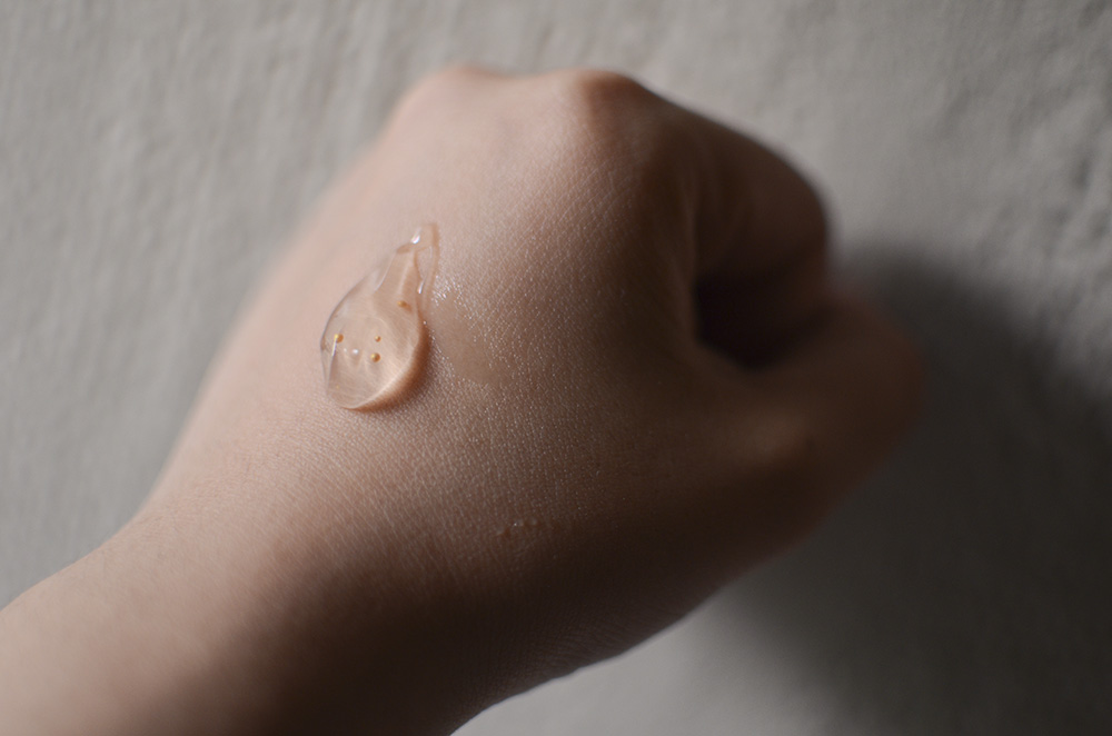 The product is more a clear gel/cream than a straight up oil. It has amino acid supplement and a vitamin capsule system—presumably delivered through the suspended golden spheres—to soften and moisturize the skin.
