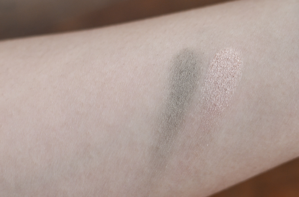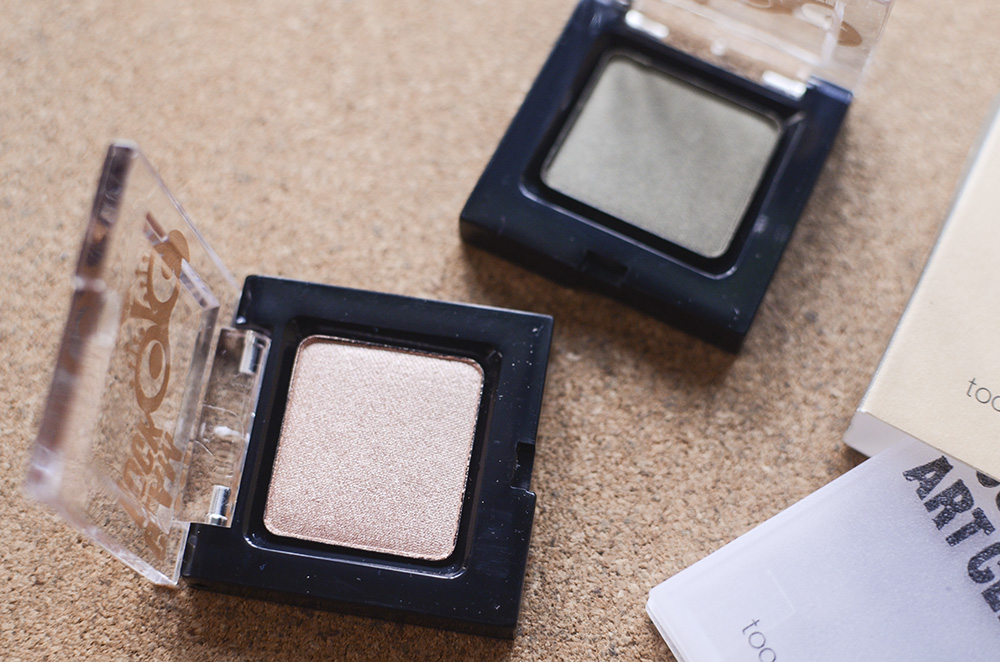 Two of my purchases from Seoul were these Glam Rock Urban Shadows from Too Cool for School. I got a dirty olive in a satin finish (13 Viva Green) and a frosty light peach (3 Peach Glow).