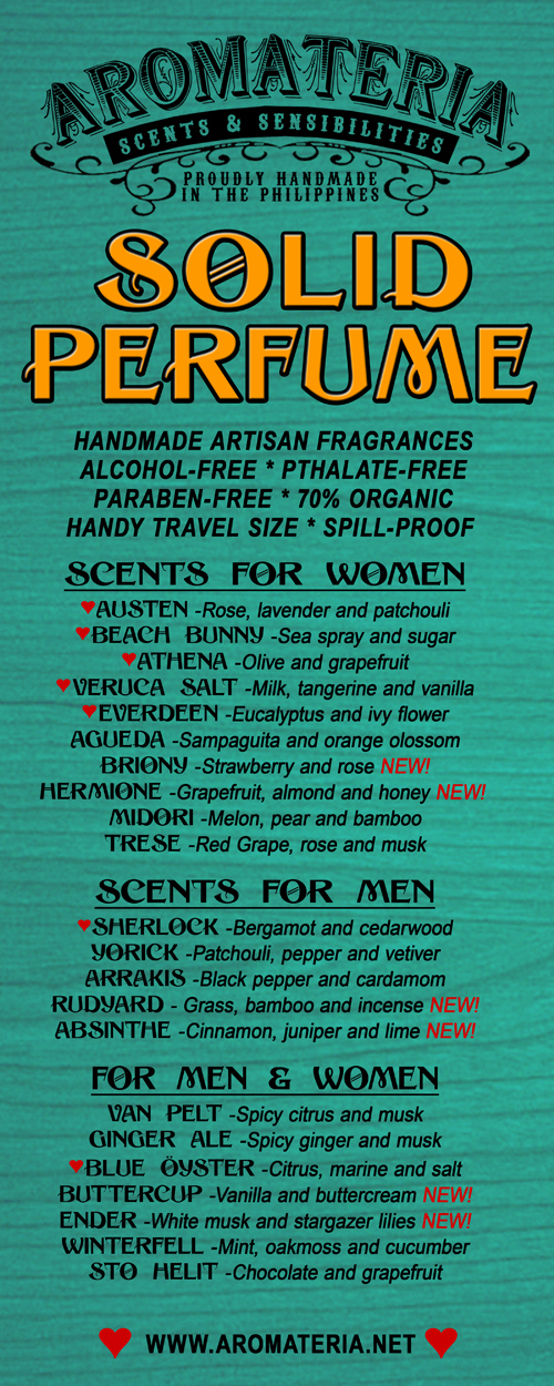 OK, so I’ve just written up a post on my main blog, Nothing Spaces, where I went on and on… and on about Aromateria. Aromateria is a local brand that makes solid perfumes. I was such a big fan of LUSH’s solid perfumes, annoying packaging aside, and I particularly liked Dirty, which is incidentally such a clean and fresh scent.