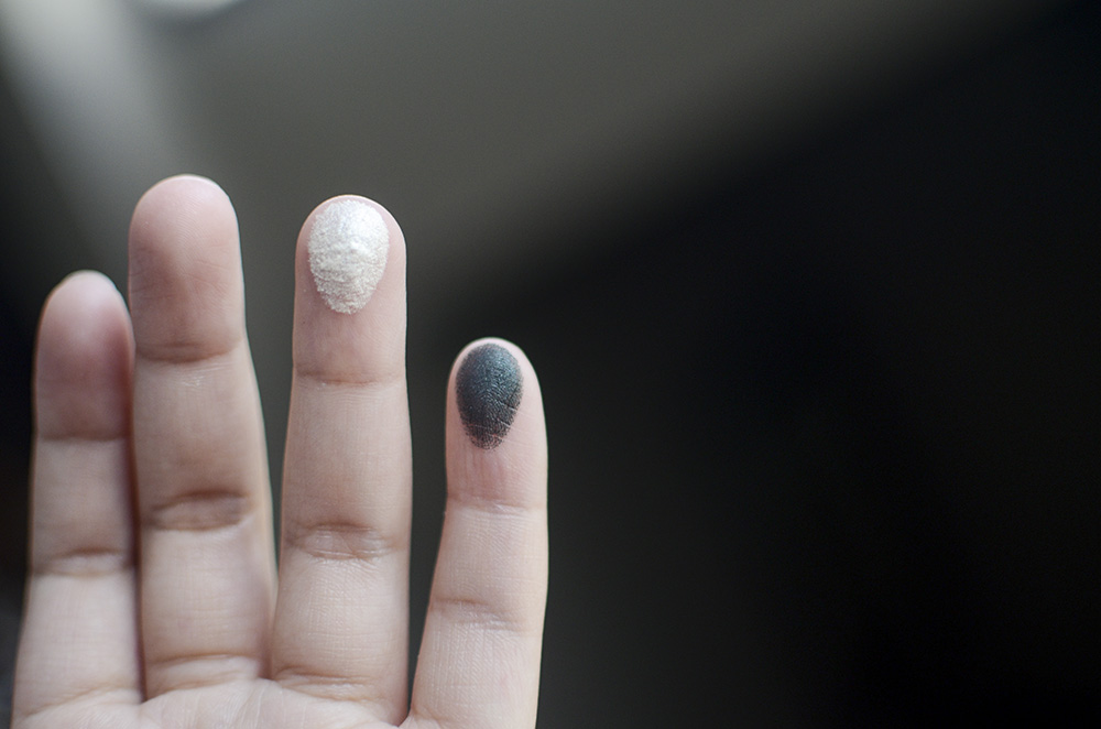 The Shimmery Sand-White shade can go on a little bit thick/chunky, so a light hand is probably all you’d need with this. The Dark Emerald Green is so beautiful and iridescent. It reminds me of beetles, for some reason.