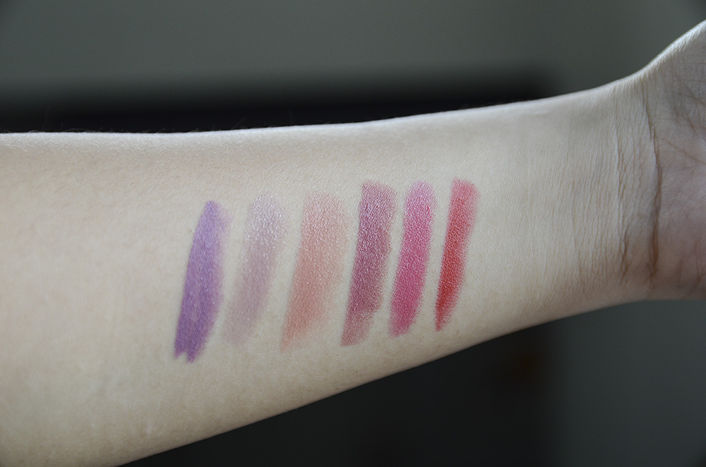 Swatched, L-R: NARS Audacious (Dominique), Bite Luminous Creme (Cava), ILIA (Funnel of Love), MAC (Twig), Tom Ford (Flamingo), NARS (Heat Wave)