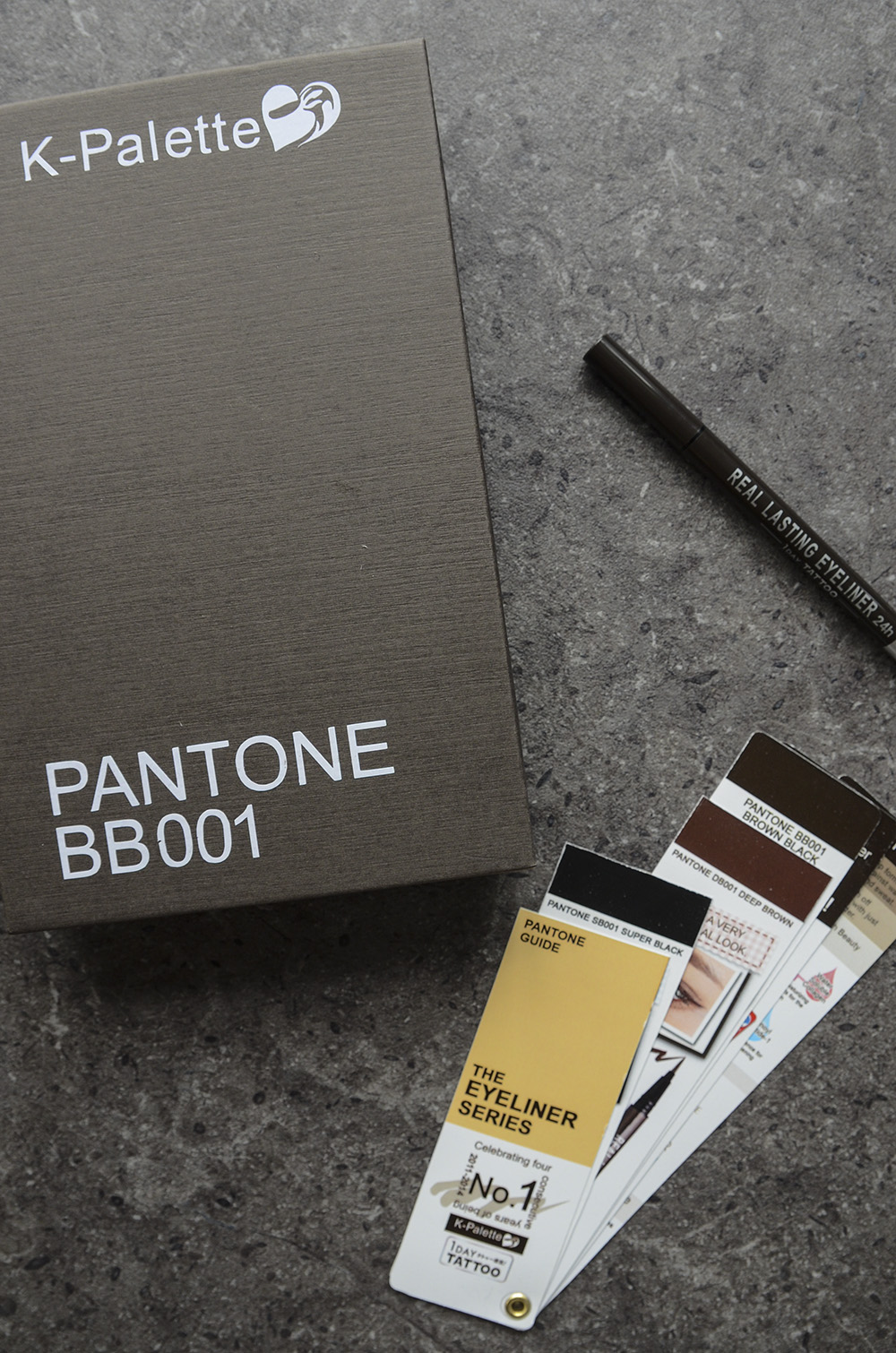 I received this super cute K-Palette package a little over a month ago, which was essentially one of their newer eyeliner colors packaged like a Pantone series, complete with a swatch booklet. This isn’t exactly an official Pantone collab; the folks over at BeautyBox Corp. were just being cute. 🙂