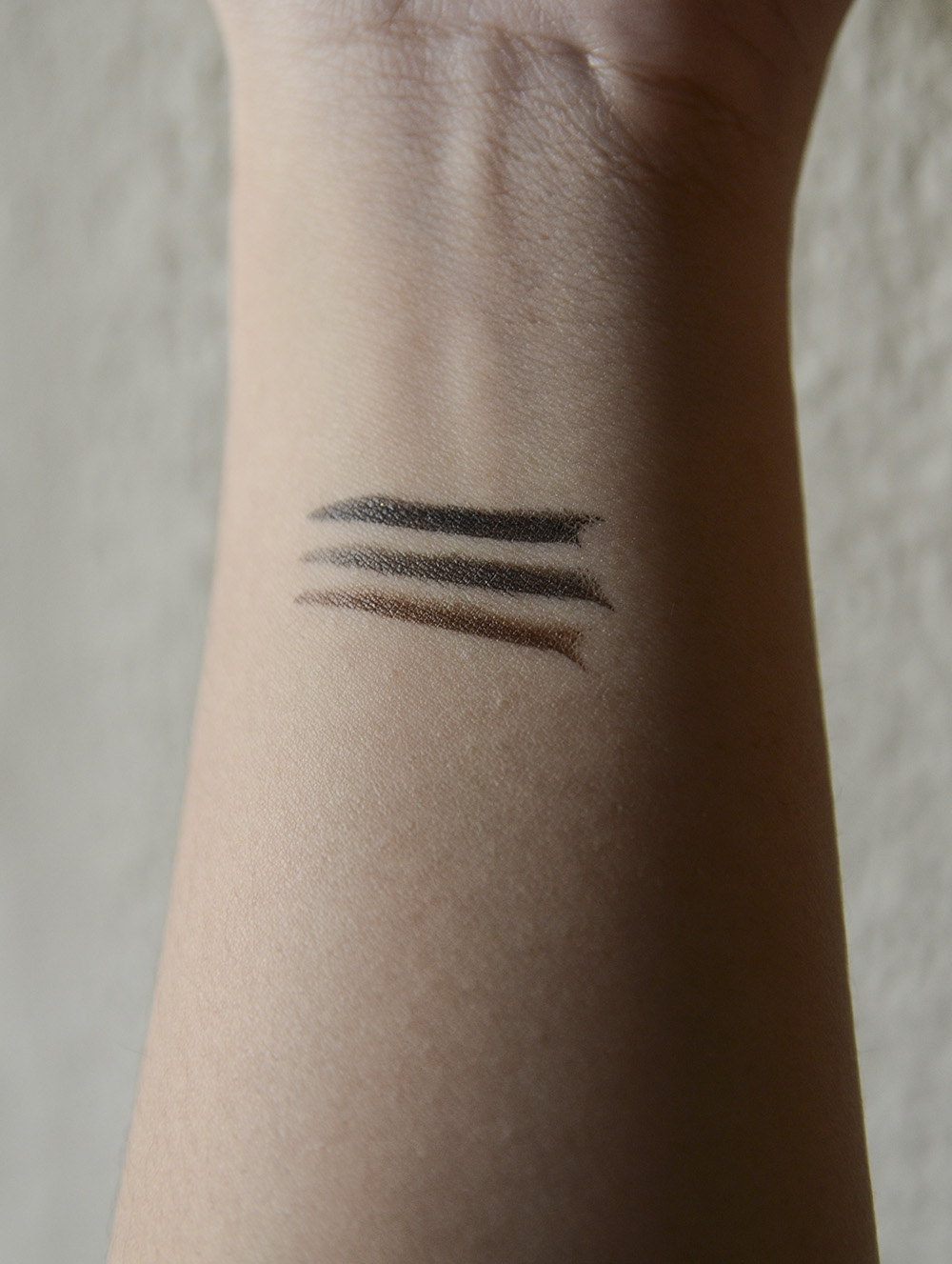 Swatched, top to bottom: SB001 (super black), BB001 (brown black), DB001 (deep brown)