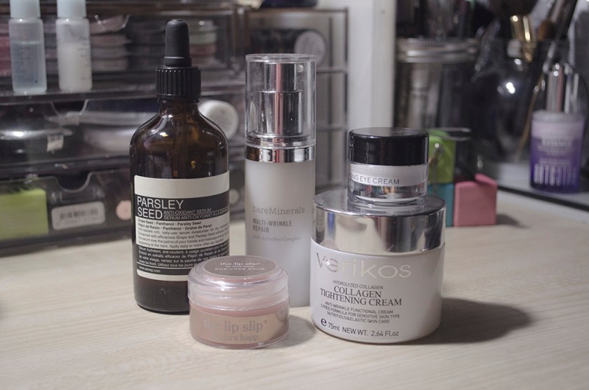 LOL the title is just a “play on words” thing for night routine. After cleansing, this is what I typically use. The heat has been so unforgiving lately, that my skin started to really freak out. I figured it was the heavy moisturizers I’d been using so I switched to a few lighter alternatives. After thoroughly taking my makeup off and sometimes toning, sometimes not, I used to use the Le Métier de Beauté Peau Vierge Complexion Serum and Dark Spot Corrector, but as it is out of my price range right now (I mean, $125 for 0.5 oz?!), I turned to the forgotten serums and anti-aging potions in my stash right now. Sidenote: You know what’s funny? It never occurred to me to research just what peau vierge meant, and it turns out it’s French for VIRGIN SKIN. Almost spit out my drink there. Ha. My usual sequence goes like this: — A generous pump of the bareMinerals Multi-Wrinkle Repair, which I purchased quite a while ago. I like it because it’s like and …